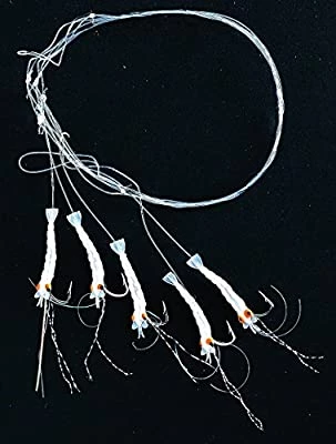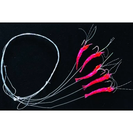 These 5-hook realistic Mustad ready-made rigs are designed to imitate baby shrimp with lifelike colors and movement. Tied with our own hooks and strong and reliable mono line. Each rig is developed with the right sized hooks and line combination to give maximum strength and durability. Great to use for Sardines, Mackerel, Herring, Yakkas, Sea Pike and Slimey Mackerel, Small Jacks, Smelt and Pilchard.10lb/4,5kg leader material.