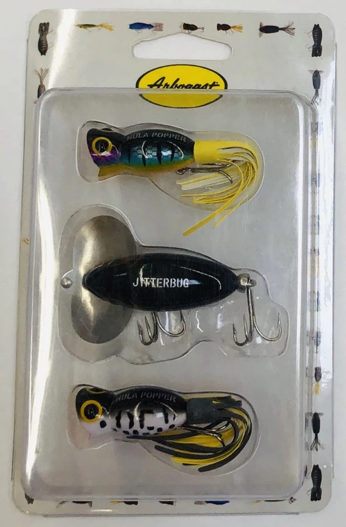 This Arbogast topwater fishing lure kit brings together the most iconic lures in fishing in the best performing patterns. Since its introduction in the 1940s, the Arbogast Hula Popper fishing lure has provoked explosive topwater strikes from millions of fish. The concave mouth throws water and produces a loud, fish-attracting “bloop” each time the lure moves. The famous Hula Popper skirt wiggles and pulsates even when the lure isn’t moving to turn curious fish into biting fish. The Arbogast Jitterbug has proven itself decade after decade to be one of the best topwater fishing lures and the best night-time fishing lure ever made. The Arbogast Jitterbug’s double-cupped lip is precisely angled so it produces a loud, rhythmic, surface-busting sound that is proven to be an irresistible attractant to gamefish and draws the attention of fish from long distances. Introduced in the 1930s, the Jitterbug has been the favorite topwater lure for generations of anglers thanks to time-tested performance.