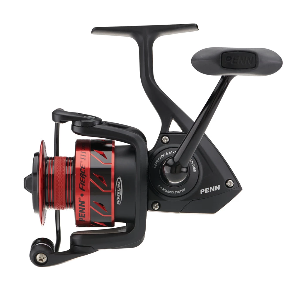 The PENNĀ® FierceĀ® III spinning reels are available in a range of sizes, from 1000 to 8000. Featuring a full metal body and sideplate, along with PENN HT-100⢠carbon fiber drag washers, the Fierce III can handle anything inshore or nearshore. A 4+1 shielded stainless steel ball bearing system ensures smooth retrieves while the heavy-duty aluminum bail wire and superline spool allow for easy line management.Ā