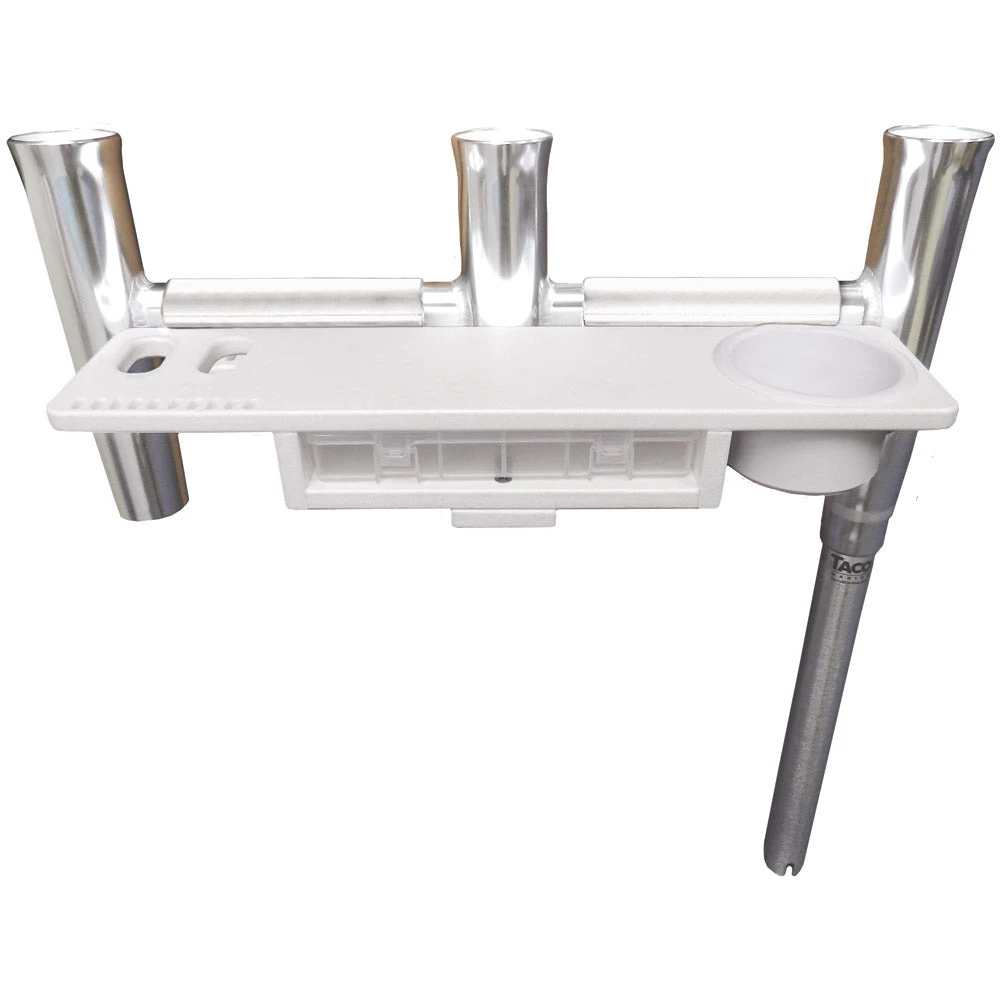 Taco Sport Fishing introduces a strong and durable high polished aluminum 3-rod holder cluster with an offset design to maximize rod placement and usage on your boat. Great for kite fishing or as 3-rod holders in one. Fits all standard gunnel mount rod holders. Along with maximizing space, a tool tray has been added to conveniently hold fishing tackle gear and a cup holder for beverages.